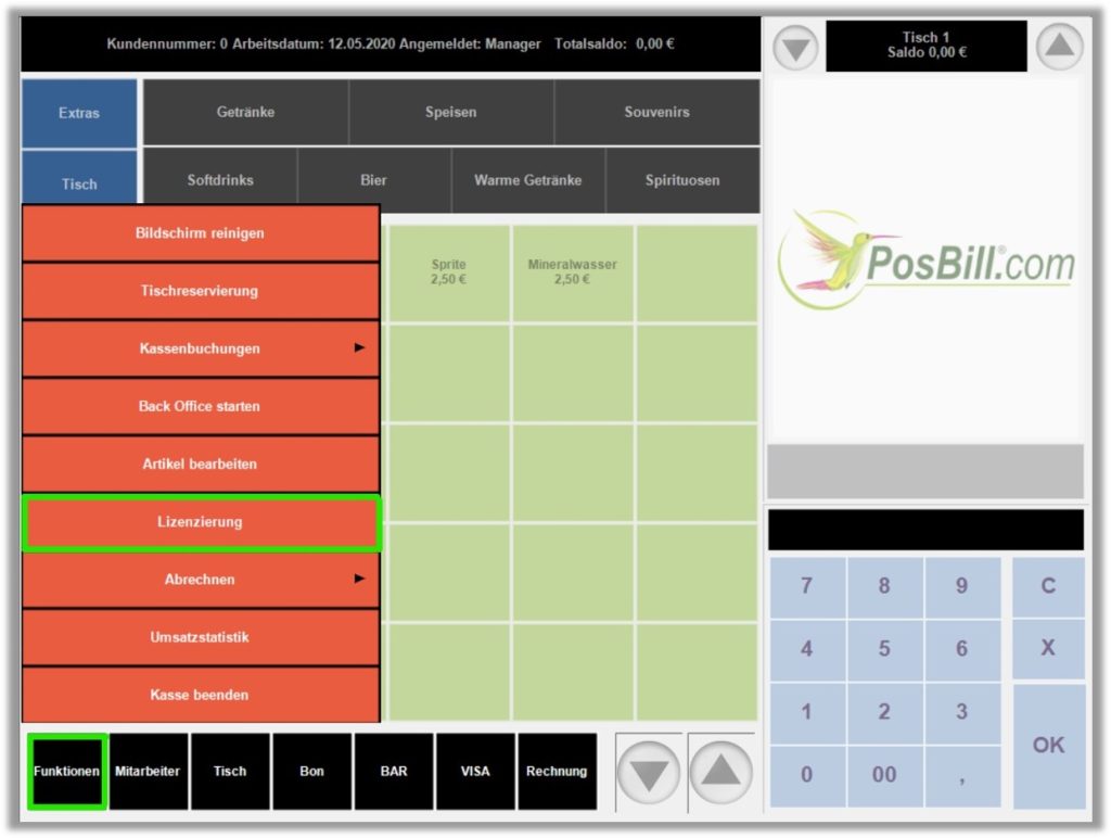 Starte Deine PosBill Kasse und öffne den Reiter Funktionen. Wähle anschließende "Lizenzierung" aus.