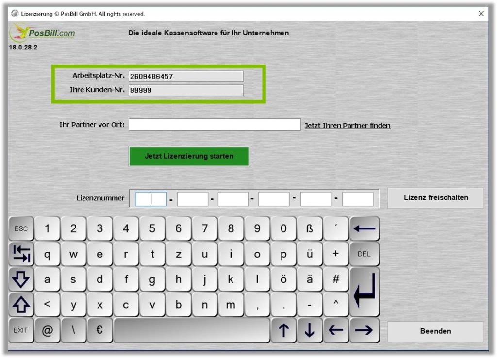 Gehe einfach in der Kassenfront Deiner PosBill Kasse auf Funktionen, danach auf Lizenzierung. Im neu geöffneten Fenster findest Du dann direkt im oberen Bereich die beiden benötigten Angaben.